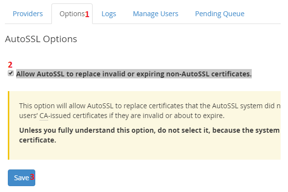 انقر فوق “options” ثم ضع علامة على “Allow AutoSSL to replace invalid or expiring non-AutoSSL certificates“