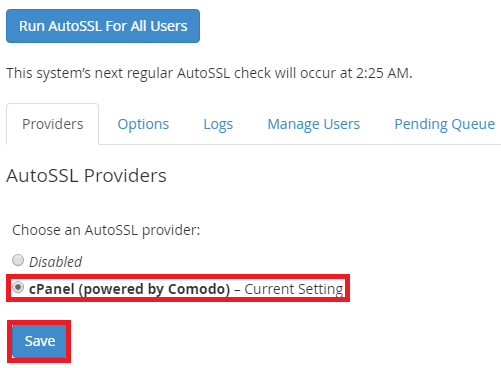 إذا كنت ترغب فقط في تثبيت شهادة SSL على جميع النطاقات / النطاقات الفرعية فانقر على زر”Run AutoSSL For All Users“.